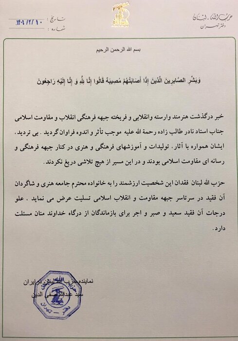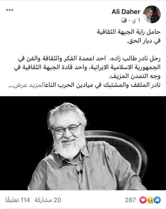 تهران-ایرنا- درگذشت حاج نادر طالبزاده از مهمترین چهرههای هنر انقلاب با واکنش فعالان هنری و رسانهای حزبالله لبنان همراه شده است.
